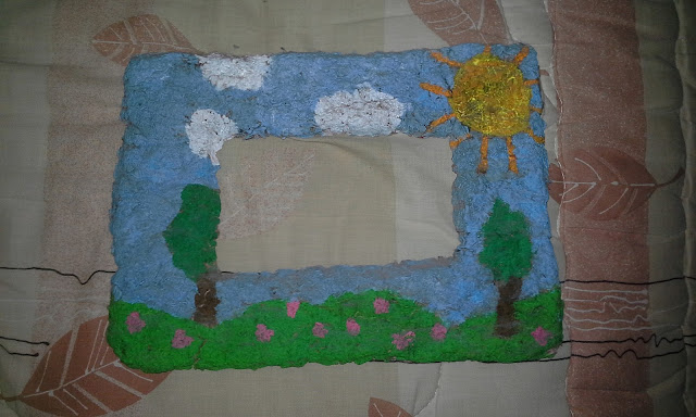 E porque me lembrei disto, sinceramente não sei em concreto, mas recordei que há uns anos, mais precisamente há 12 anos, eu e mais duas amigas oferecemos uma moldura feita por nós em pasta de papel a outra amiga. E pensei é mesmo uma boa ideia para fazer.