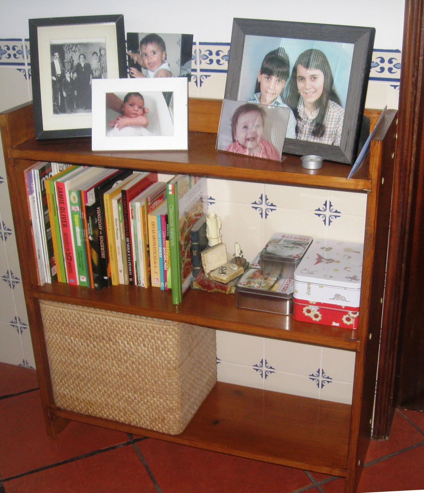Uma das estantes foi cortada ao meio em altura, fazendo assim duas estantes pequenas, uma ficou para o quarto do Luís e a segunda ficou à entrada da cozinha com os livros de receitas.