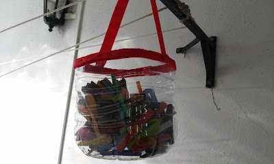 E assim fiz o meu cesto para as molas da roupa, não tenho é certeza que dure muito. E já agora não se esqueçam que de duas coisas estragadas podemos sempre fazer uma coisa útil. Aqui a mola de plastideira.