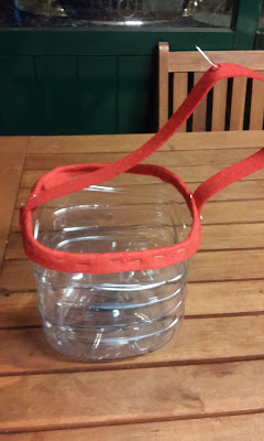 Cortei o garrafão e à volta meti feltro para não cortarmos as mãos, mas como estava com pressa prendi com agrafos, no entanti acho que resultava melhor com cola quente. Também tentei fazer a pega com feltro, mas como tentei prender com clips não resultou.
